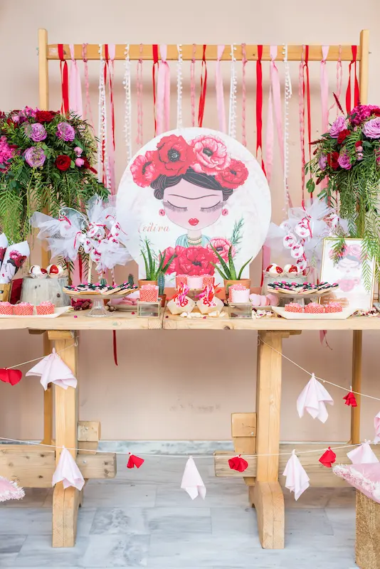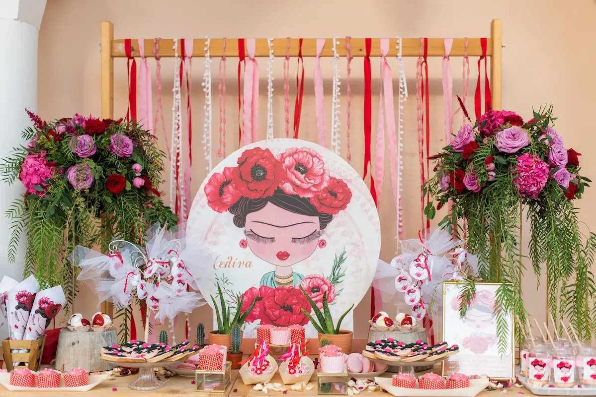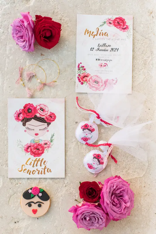 For little Melina, we designed a vibrant and artistic Frida Kahlo–inspired baptism in Athens, celebrating color, femininity, and timeless Mexican aesthetics.