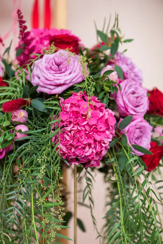 We developed a fully thematic concept, drawing inspiration from Frida Kahlo’s iconic floral crowns, bold color palette, and expressive artistic identity. Rich shades of red, fuchsia, and soft pink were combined with lush greenery and statement floral compositions, creating a striking and joyful atmosphere.