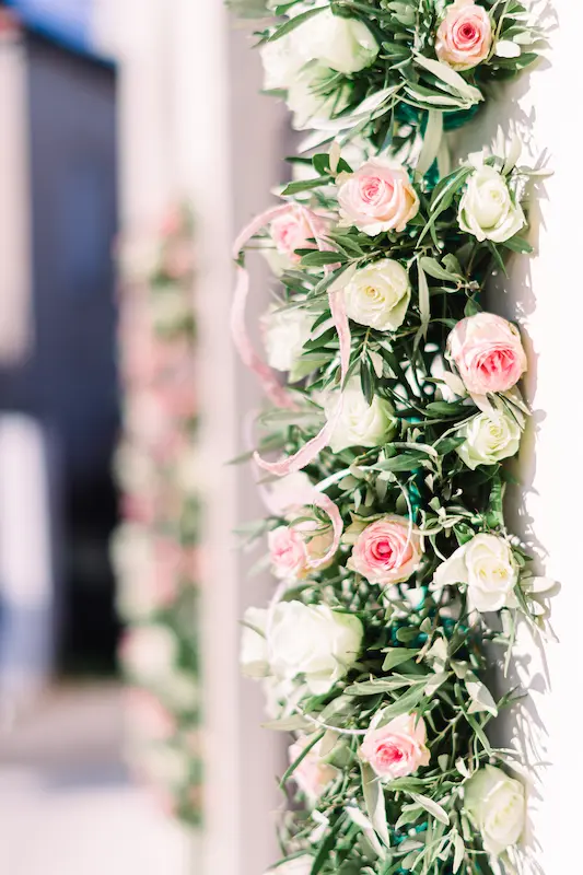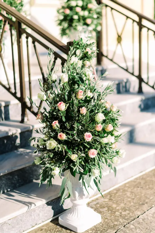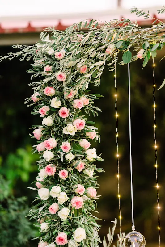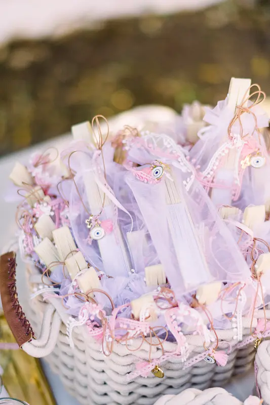 The color palette was soft and refined, delicate blush pinks paired with crisp white tones and touches of olive green. The presence of olive branches symbolized peace, blessing, and longevity, while subtly reinforcing the Greek essence of the event.