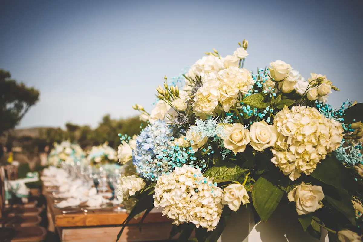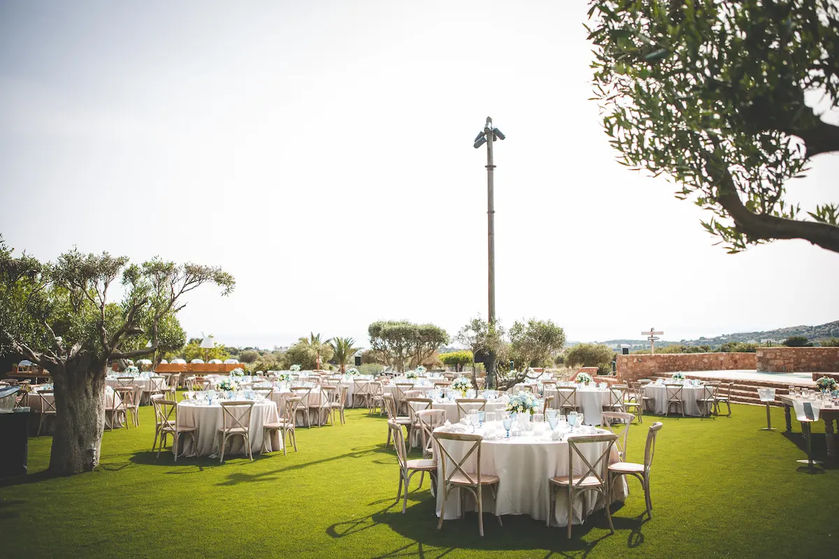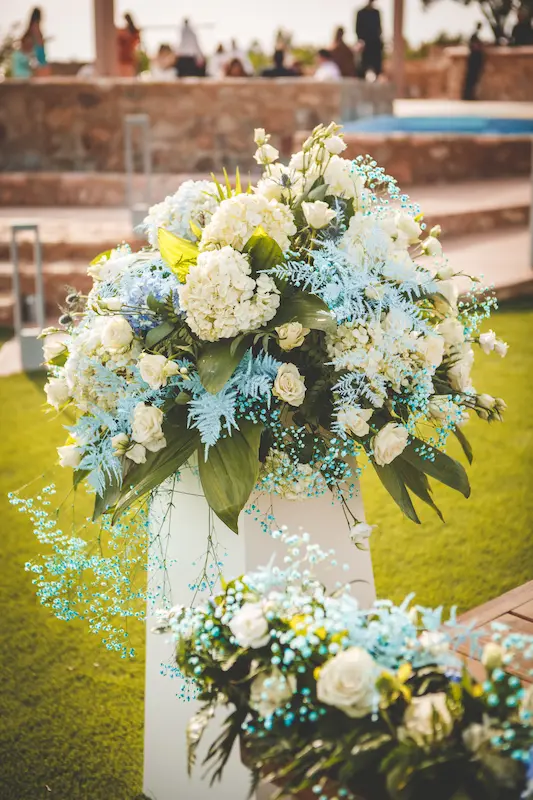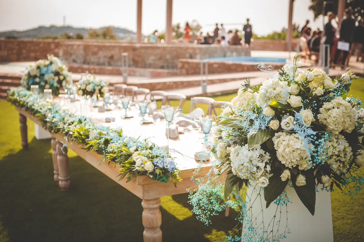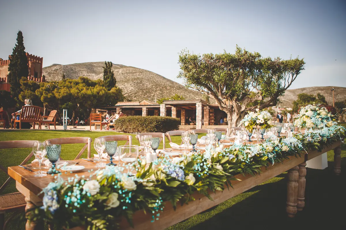 A harmonious palette of soft blues and crisp whites defined the concept, reflected in the carefully styled tablescapes, delicate floral arrangements, and crystal-clear glassware. The outdoor reception unfolded in the lush gardens of the venue, creating a warm and intimate atmosphere under the open Attica sky — the perfect setting for a memorable christening in Athens.