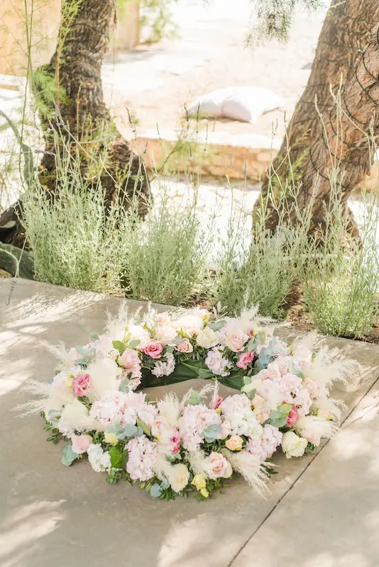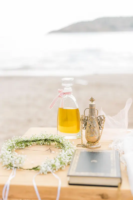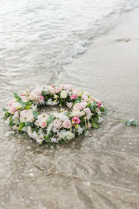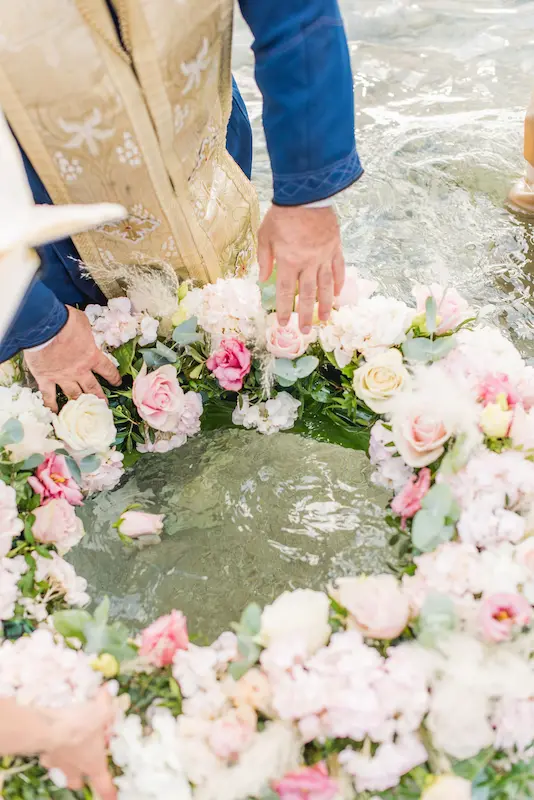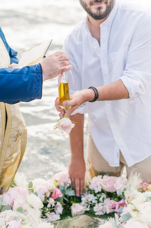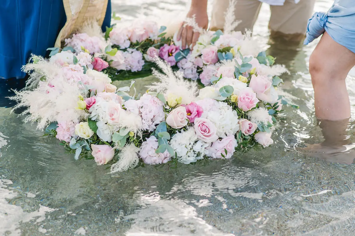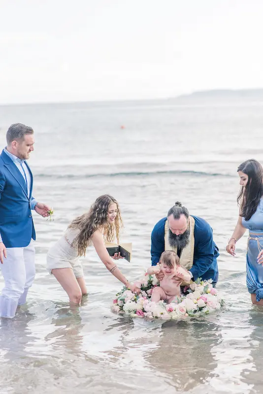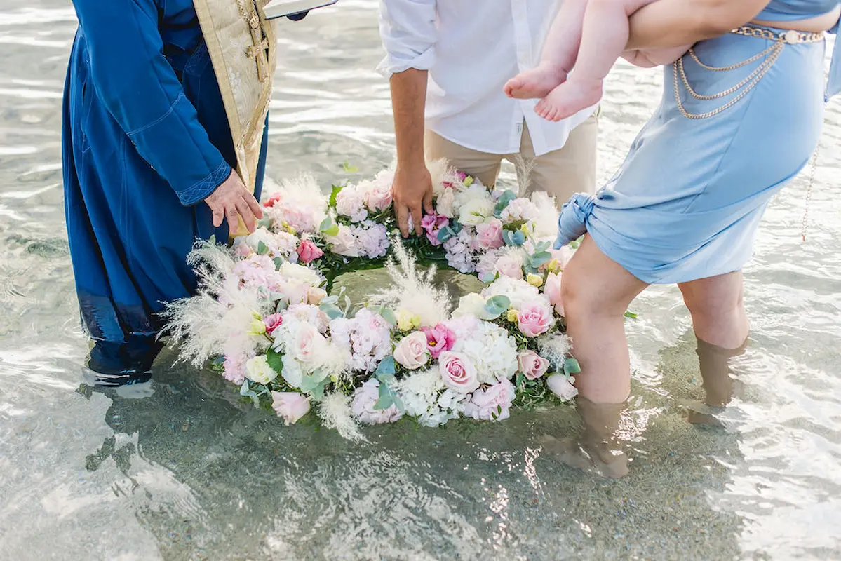 Instead of a conventional baptismal font, a delicate floral wreath was prepared and gently placed in the water, creating a poetic and unforgettable seaside baptism ceremony.