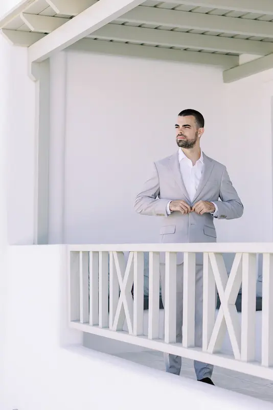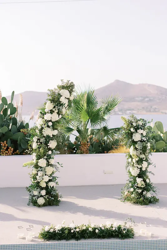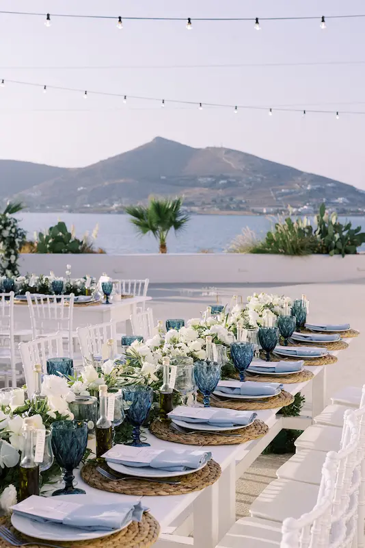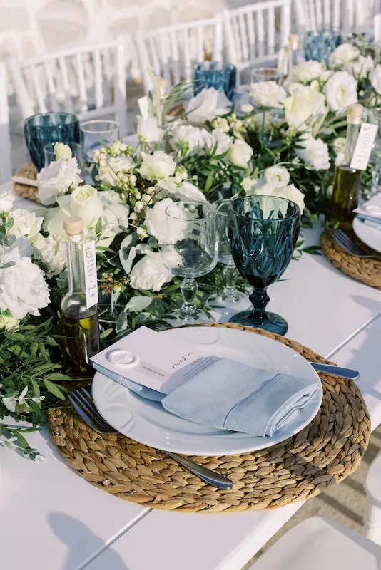 Inspired by the island’s natural palette, we embraced crisp whites and deep blues, accented with refined silver details. Every element was thoughtfully curated to complement the breathtaking surroundings while creating an atmosphere of modern romance.