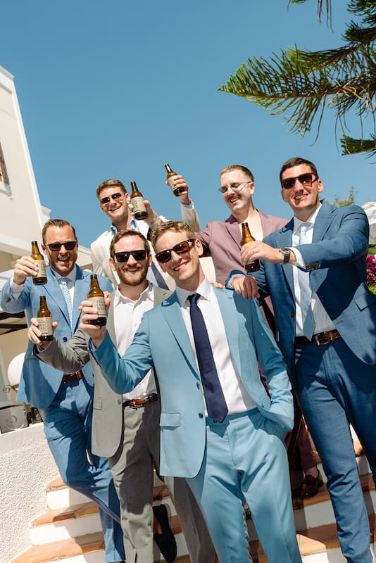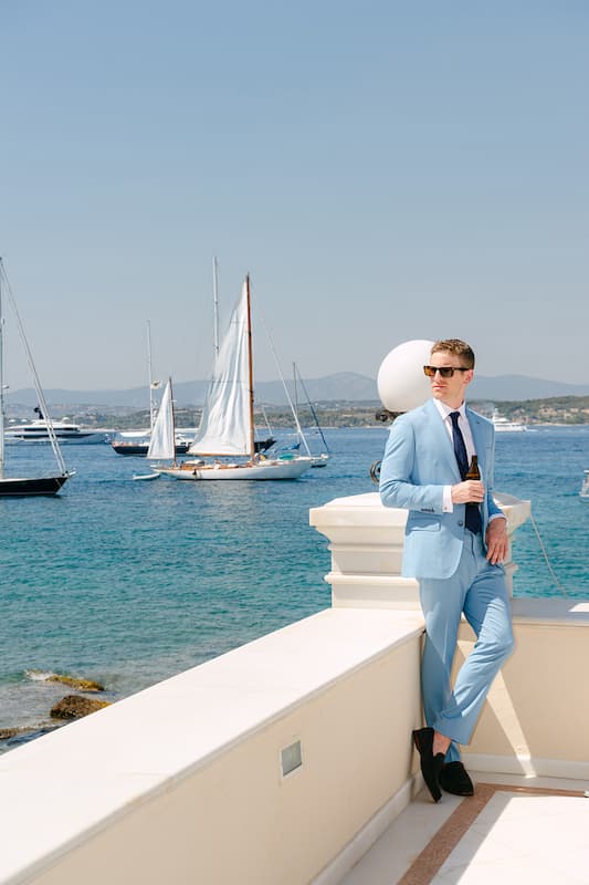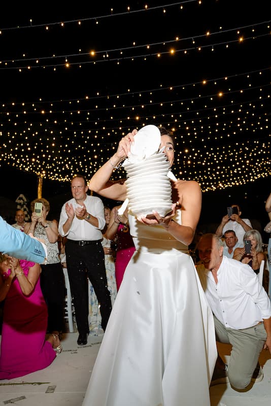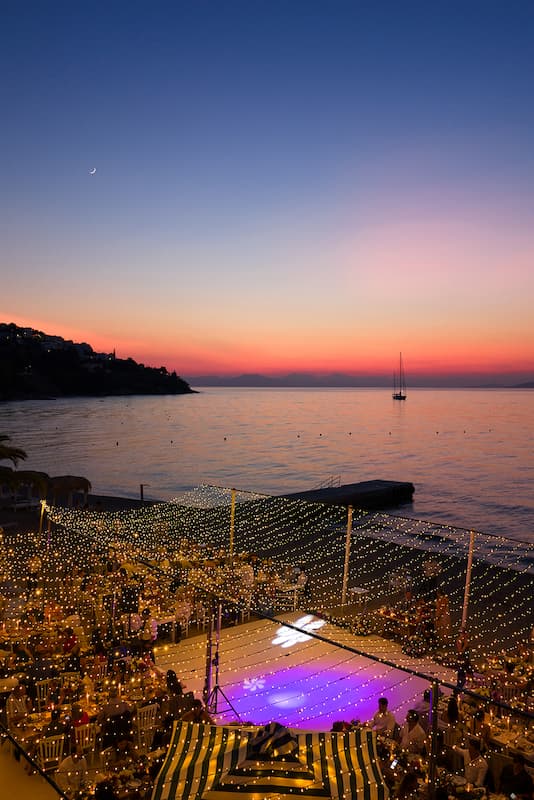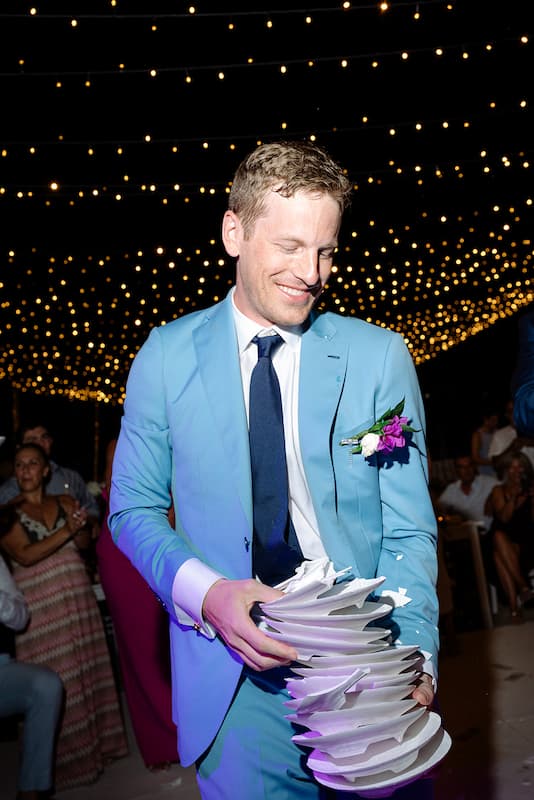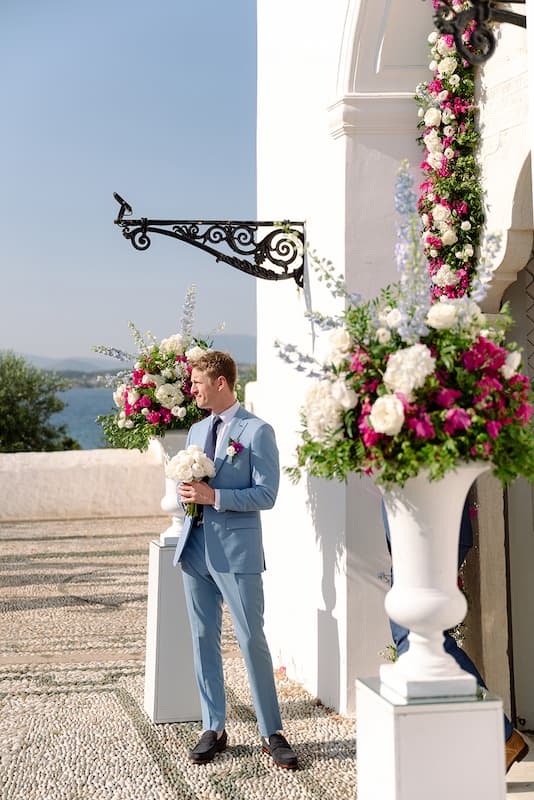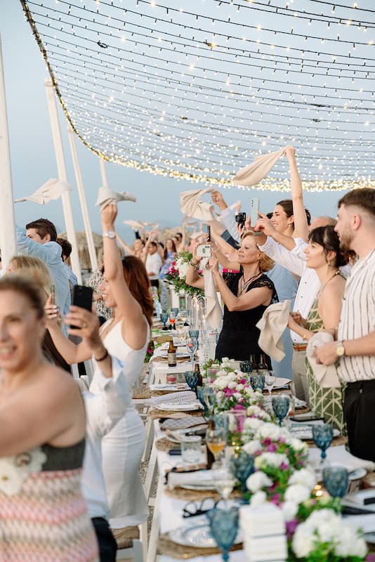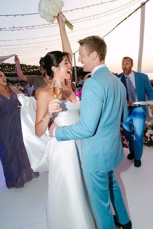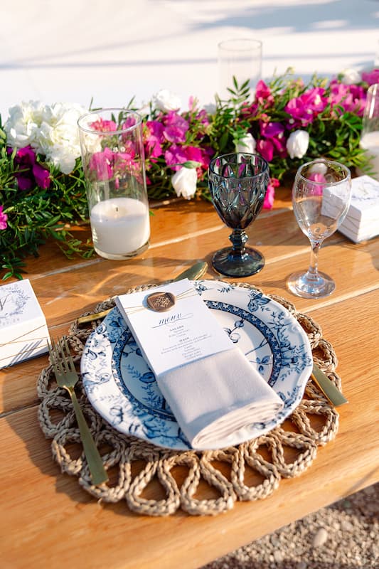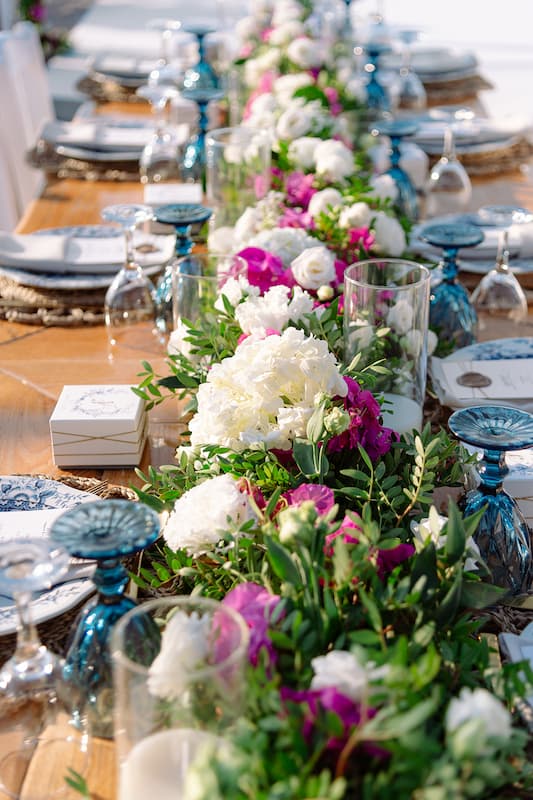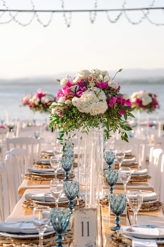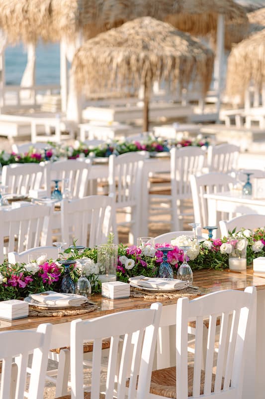 Lush floral arrangements in vibrant fuchsia bougainvillea tones were paired with soft blue accents and refined white details, creating a fresh, joyful aesthetic that perfectly captured the essence of a chic Greek island wedding.The festivities continued at Kaiki Beach Spetses, where the wedding party transformed into an unforgettable Greek island celebration. Beneath the summer sky, guests danced until sunrise, immersed in authentic Mediterranean vibes, traditional music, and the exhilarating ritual of plate smashing, an iconic symbol of Greek festivity and passion.