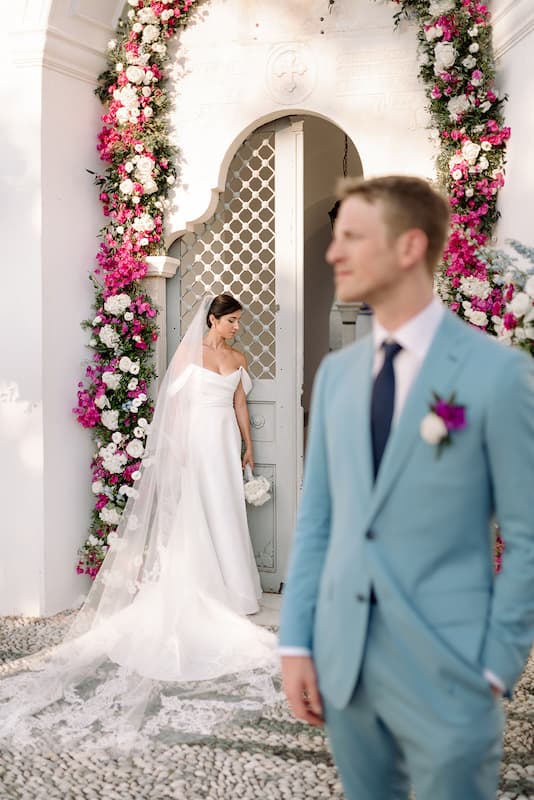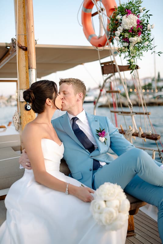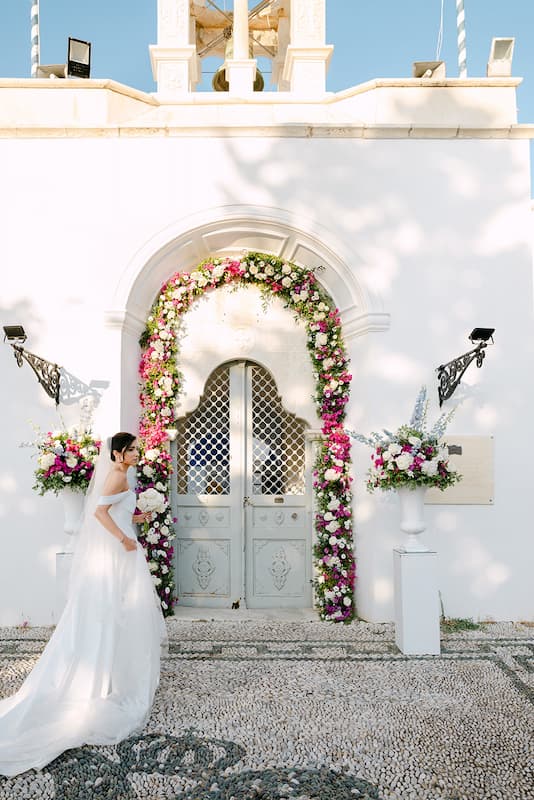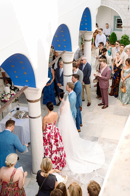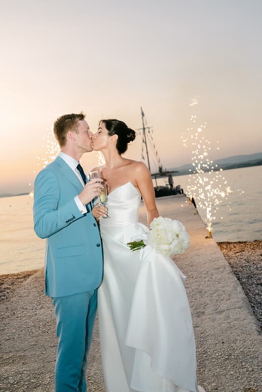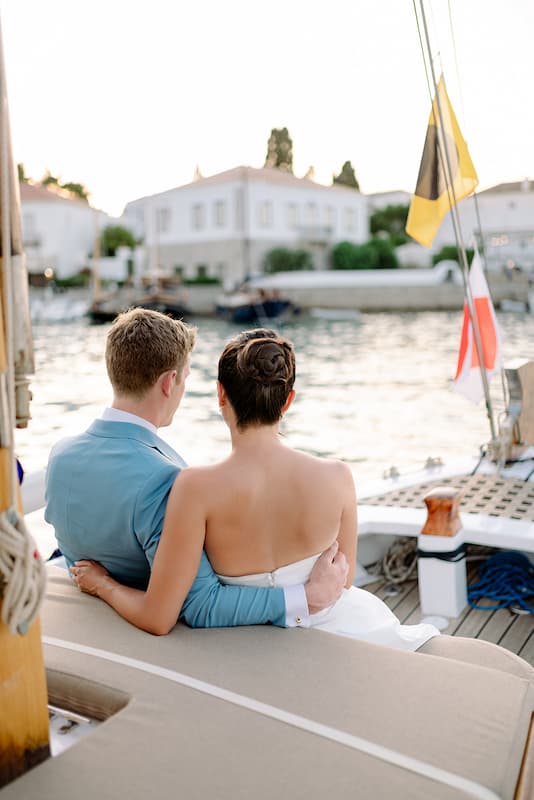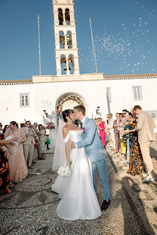 The couple, who traveled from the United States, chose to celebrate their destination wedding in Spetses surrounded by the island’s historic charm, neoclassical architecture and breathtaking Aegean views.The ceremony took place at the iconic Agios Nikolaos Church Spetses, located at the Old Port, one of the most picturesque wedding ceremony locations in Greece.