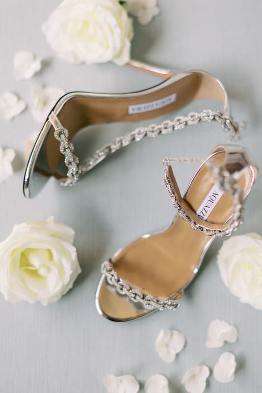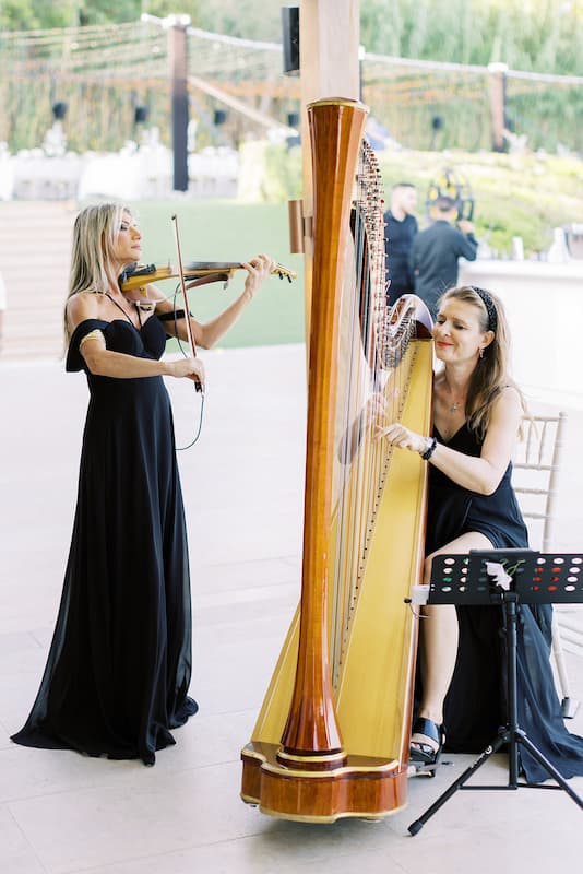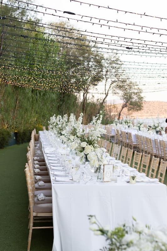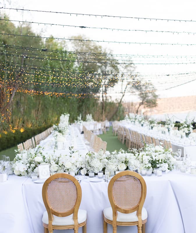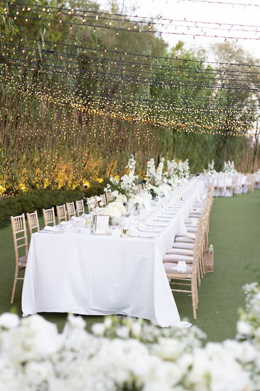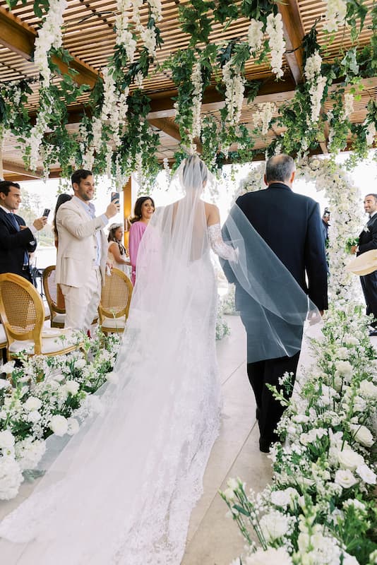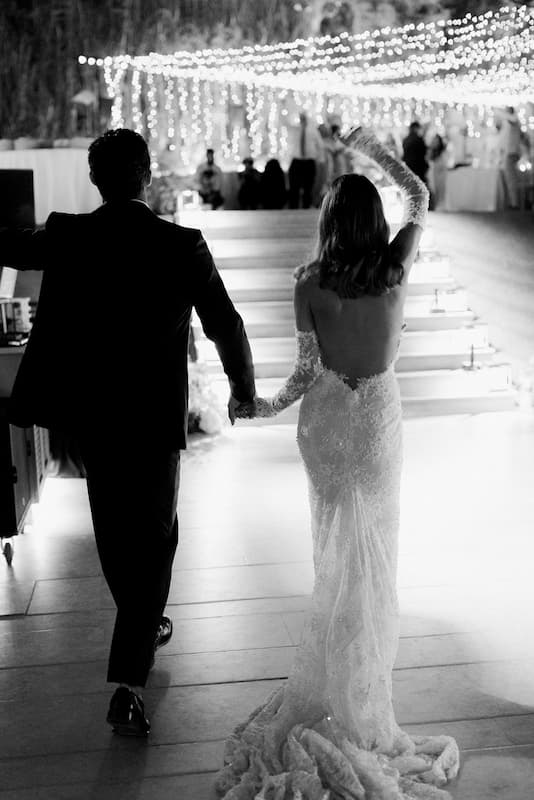 But they didn’t stop there: a harp performance, a romantic violinist, a dreamy aisle dripping with white blooms and wisteria, a blanket of twinkling lights overhead, and a vintage white wedding car revved up the glam.
